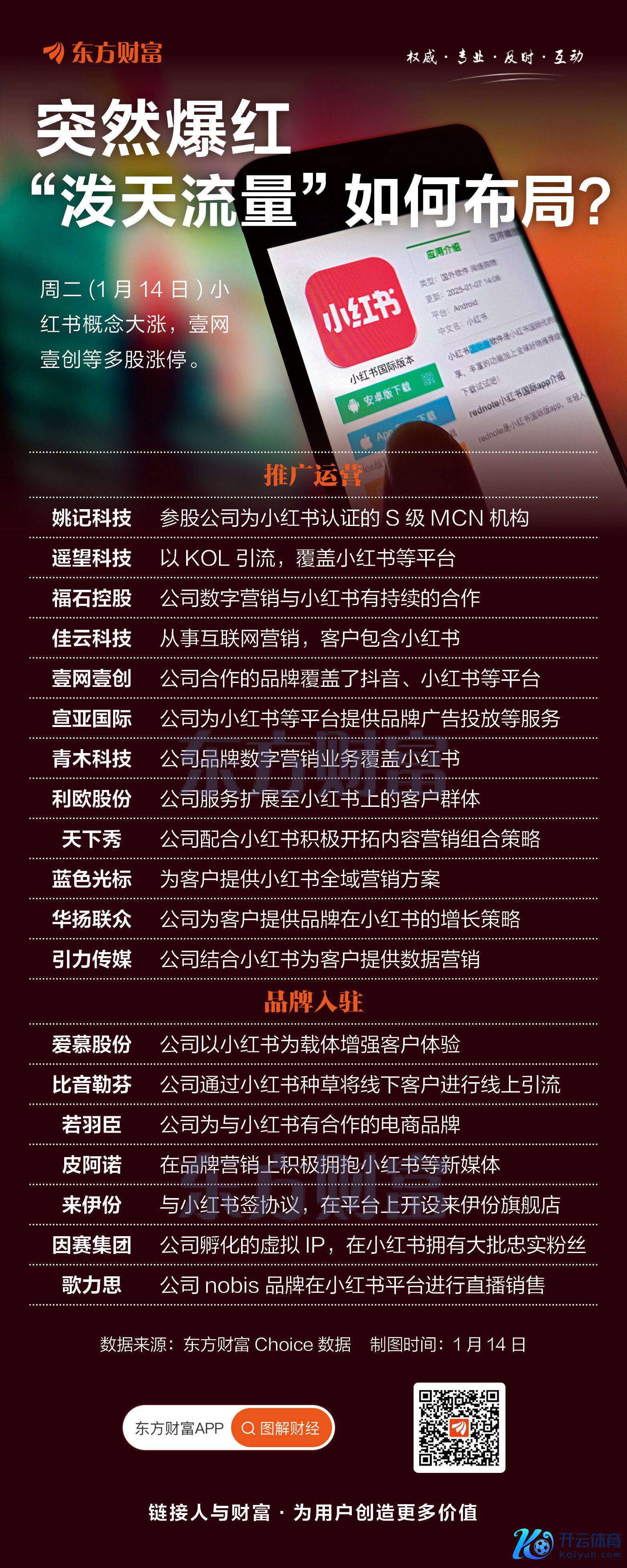 周二(1月14日)小红书主张股集体大涨,福石控股、壹网壹创等20CM涨停,六合秀、华联扬众等多股涨停。